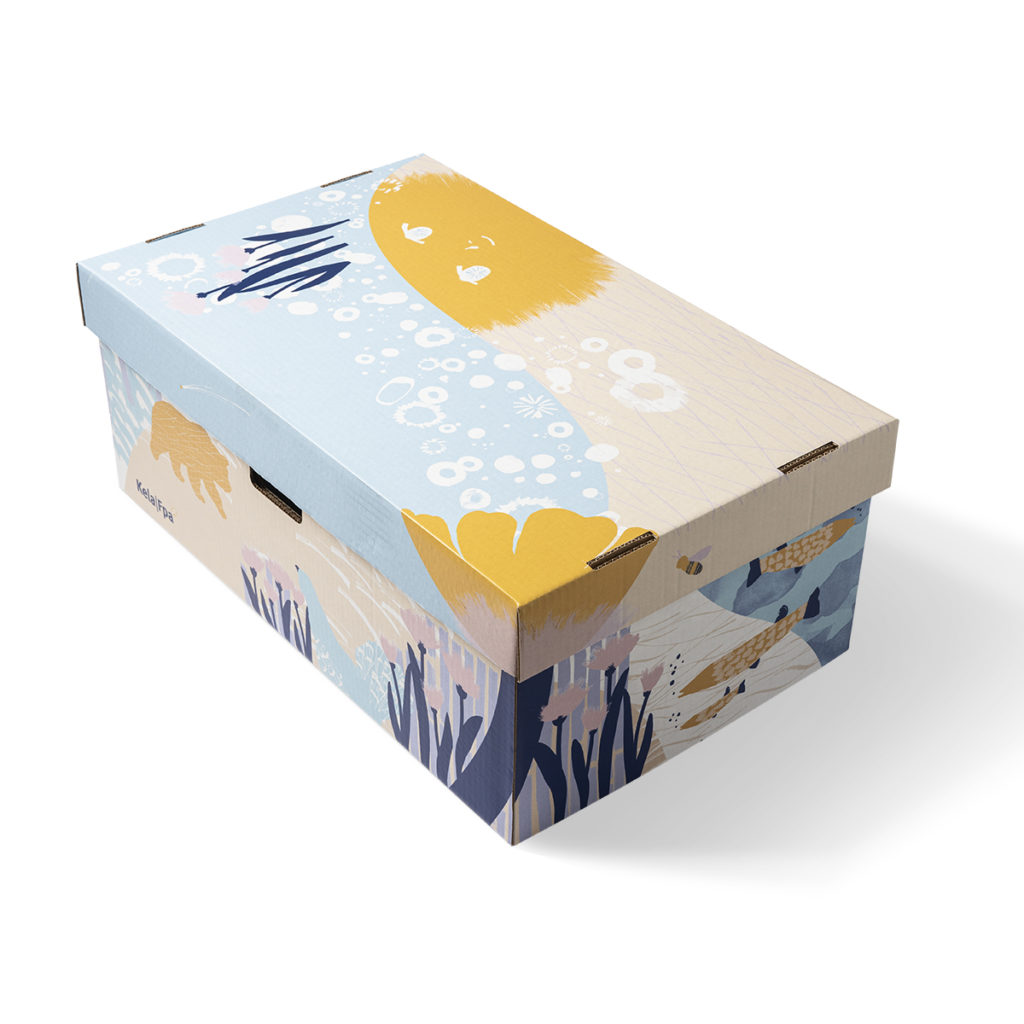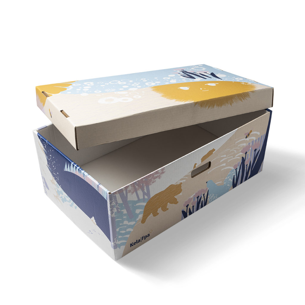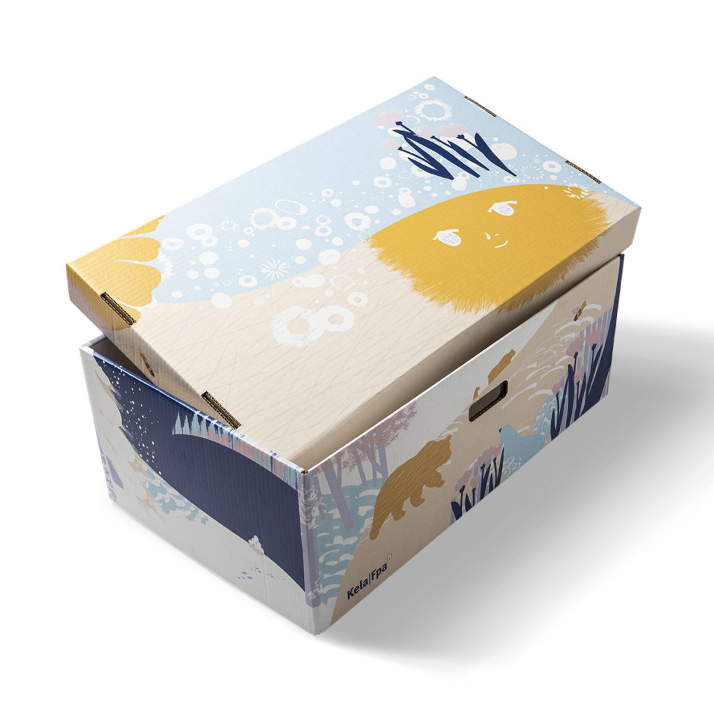 Pakkauksen ilmeen on suunnitellut Aya Iwaya. Ilmeen nimi on Perhe. Vuodelaatikon kuvituksessa seikkailevat sulassa sovussa karhu, hevonen, joutsen ja riekko sekä muita kotimaisia eläimiä perheineen. Pakkaus valittiin vuonna 2017 suunnittelukilpailussa, jonka Kela järjesti nuorille suunnittelijoille ja kuvittajille 80-vuotiaan äitiyspakkauksen kunniaksi.